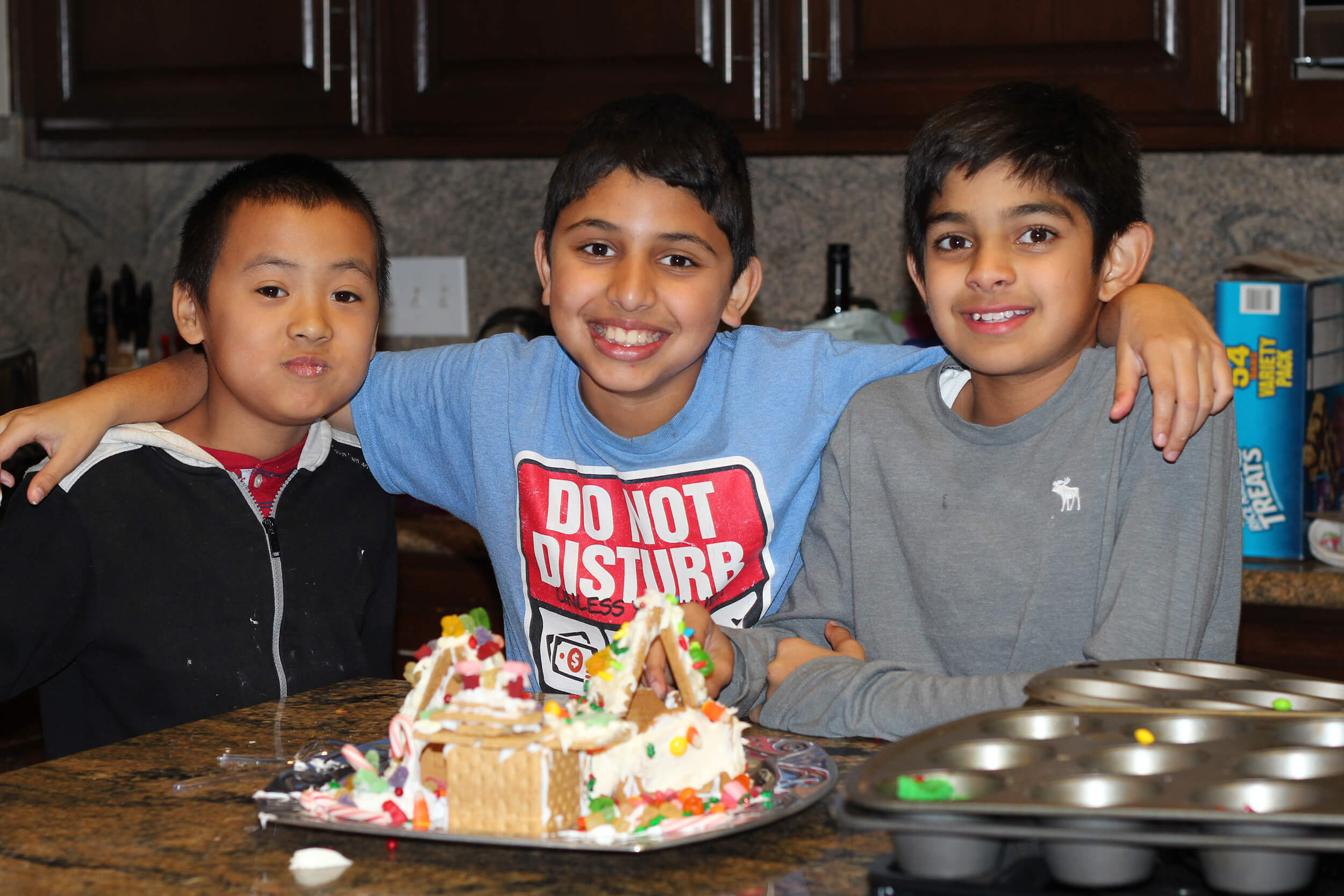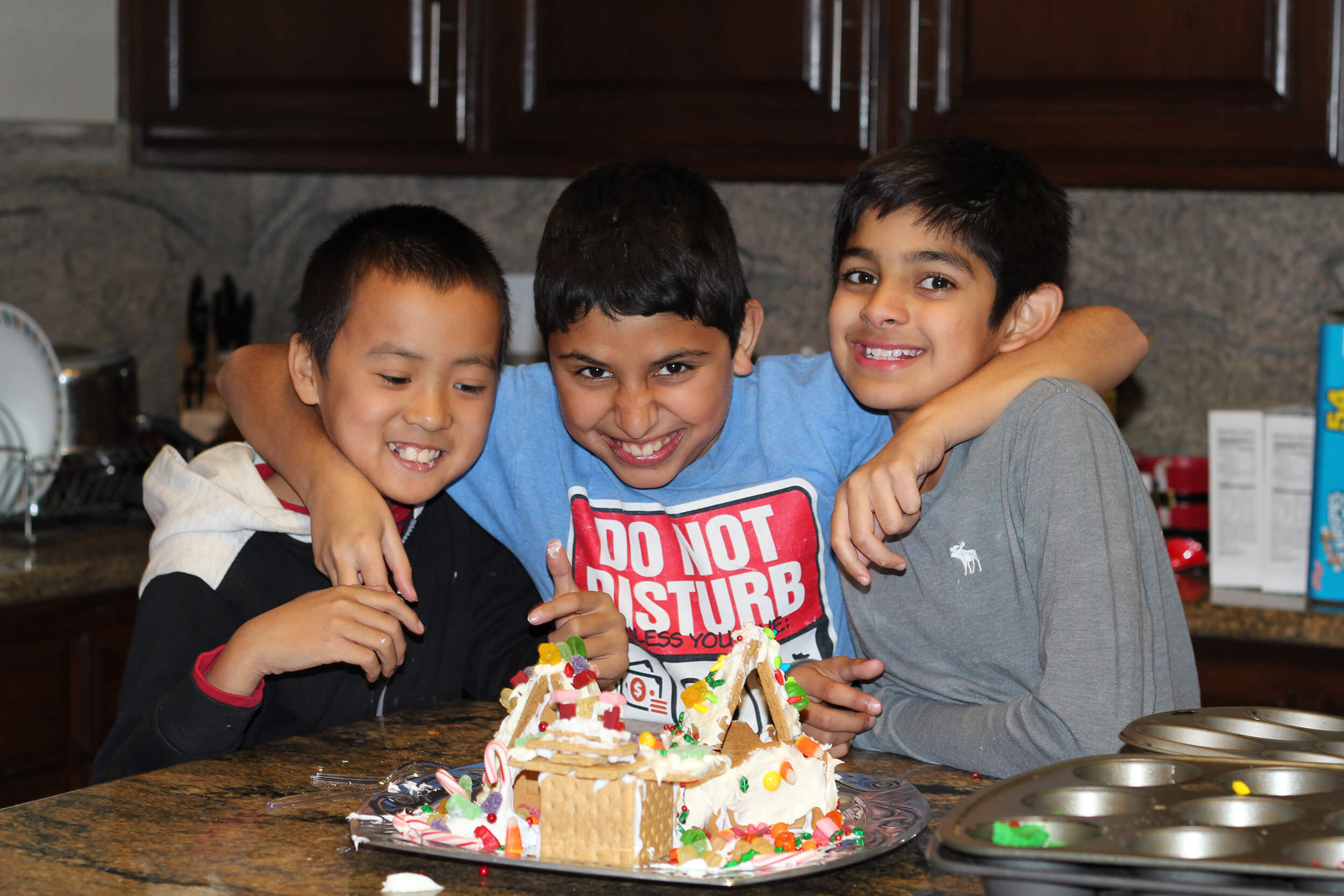 This year Jatin had Mark our neighbor and Neel over to decorate Gingerbread Houses. In typical boy fashion, more attention was spent on throwing and eating the candy instead of decorating! Boys will be boys. It was fun though and they had a great time. The gingerbread village lasted all of 30 minutes before it was destroyed by rambunctious play!